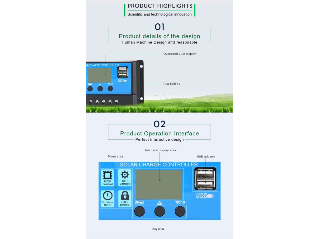 Jedná se o nový solární regulátor, který dokáže splnit požadavky vašeho fotovoltaického systému (včetně systému domácího osvětlení). K dispozici jsou modely s nabíjecím proudem 20A, 30A, 60A. Funkce: 1. Integrovaný průmyslový mikroprocesor. 2.Velký LCD displej, přes který je možno nastavit všechny parametry. 3. Čtyřstupňové řízení nabíjení PWM. 4. Zabudovaná ochrana proti zkratu, ochrana proti otevřenému obvodu, ochrana proti zpětnému chodu a ochrana proti přetížení. 5. Dualní Mosfet ochrana proti zpětnému proudu. 6. Nízká produkce tepla.